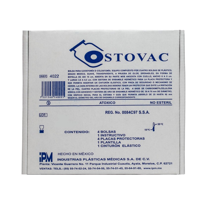 - Equipo compuesto de 4 bolsas de plástico, grado médico, suave, transparente, a prueba de olor, drenables, en forma de botella de 30 x 15 cm y cuatro placas protectoras de la piel a base de carboximetilcelulosa sódica con adhesivo y sistema de aro de ensamble hermético de 55 a 70 mm de diámetro.
