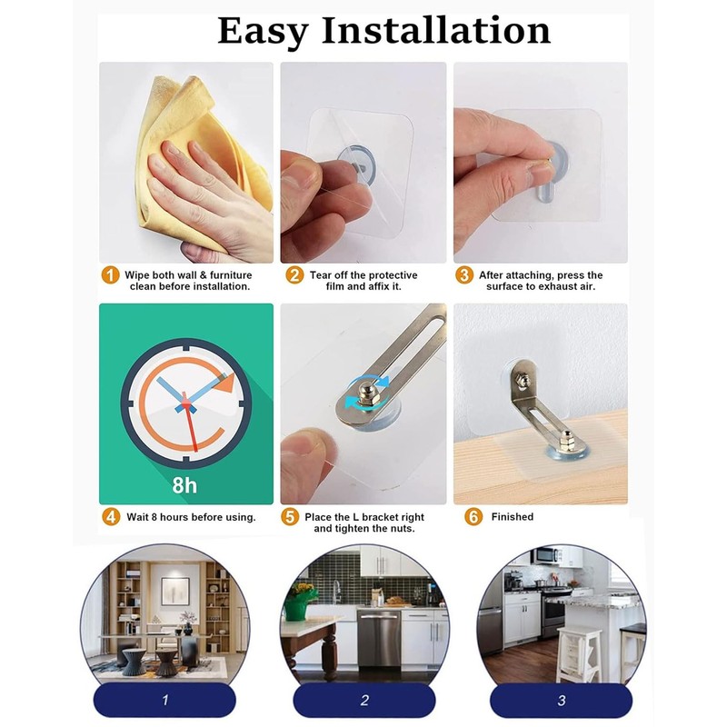 Furniture anchor set: the tilt-proof furniture anchor requires no drilling and has the attachment principle of the "L" clamp, a thickened stainless steel base and large, sticky furniture anchor pads to achieve strong stability.