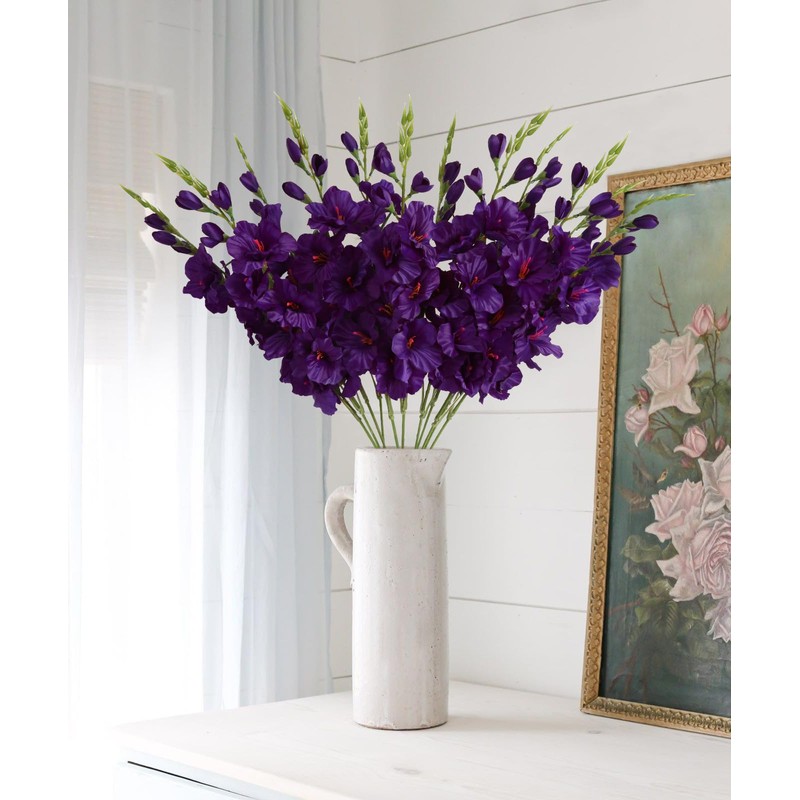 - Size and Quantity: The gladiolus artificial flowers are about 30.3 inches (77 cm) long overall. Each has 6 large flowers and 3 small buds, and has 2 long leaves. The package includes 10 artificial gladiolus flowers