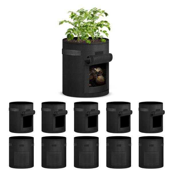 iPower 10-Pack 7-Gallon Potato Grow Bags Thickened Non-Woven Aeration Fabric Container Planter Pots with Handle, Access Flap and Velcro Window, Easy to Harvest, for Tomato, Vegetables