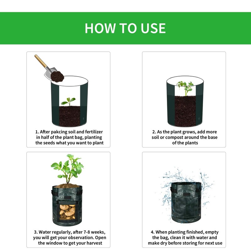 - Widely use: Perfect to use at patios, gardens, balconies, sunrooms and any indoor/outdoor space. Vegetable grow bags can be used to plant potato, sweet potatoes, taro, radish, carrots, onions, peanuts, herb and other vegetables