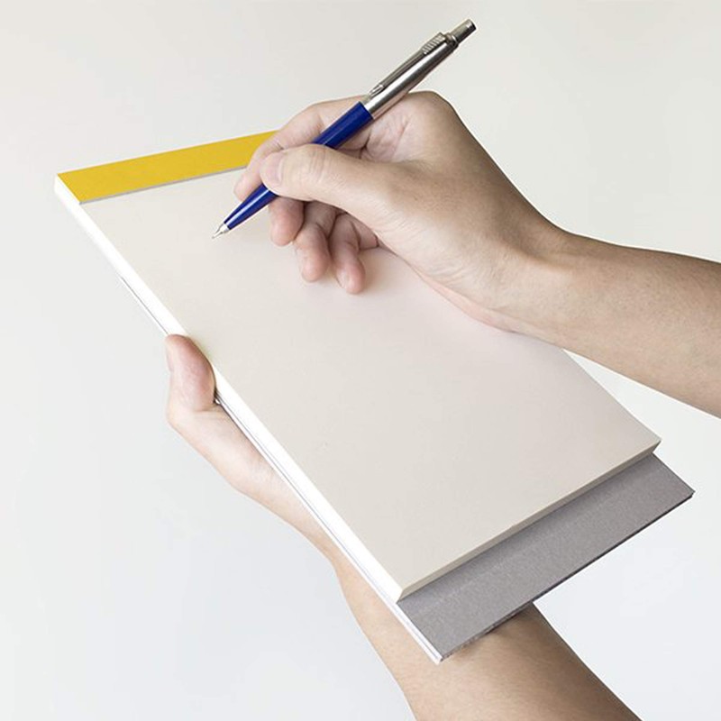 This unique and stylish memo pad is made by Japanese craftsmen. Easy to use A5 (5.8 x 8.3") and easy to fit in the bag. The memo pad features a hard cover. The half-cut cover can be turned 180 degrees. Includes 50 blank pages with micro sewn binding so you can easily tear off pages one by one. Made in Japan. Color - black/gray