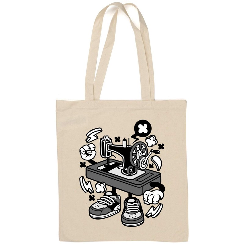 Iprints Cartoon Style Old Mechanic Sewing Machine Natural Cotton Tote Bag