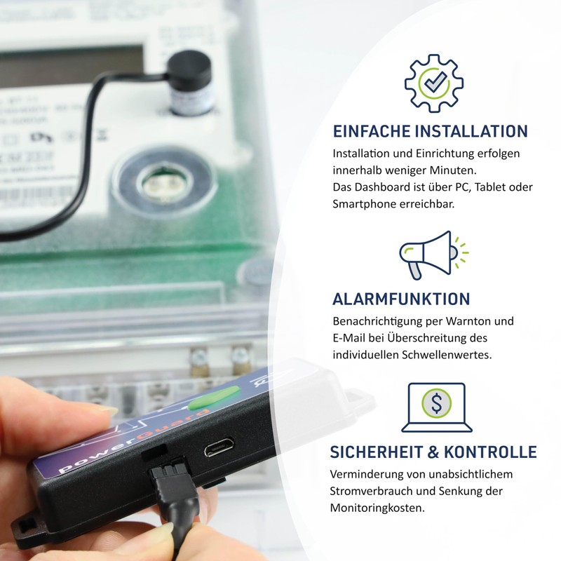 - Alarm function: you have the option to set individual cost limits. The powerGuard warns you when you consume more power than you want. So you can react quickly and specifically and keep an eye on the costs.