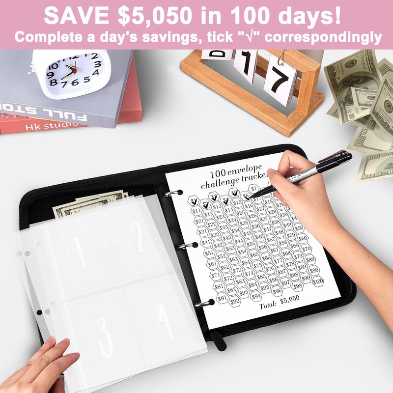 - 【Easy to Use】100 envelopes money saving challenge makes money saving and budgeting so fun. Write your savings challenges goal, and tick "✔" on tracker sheet after you finish a day's savings. The savings challenge book with top loading envelopes for easy money insertion, great for cash storage and display.