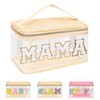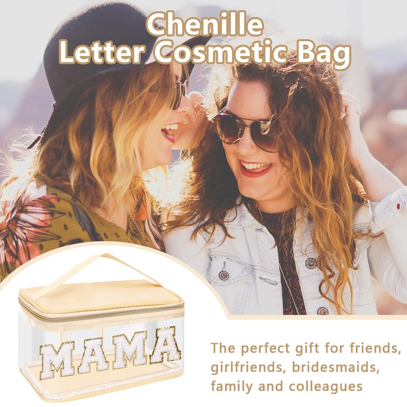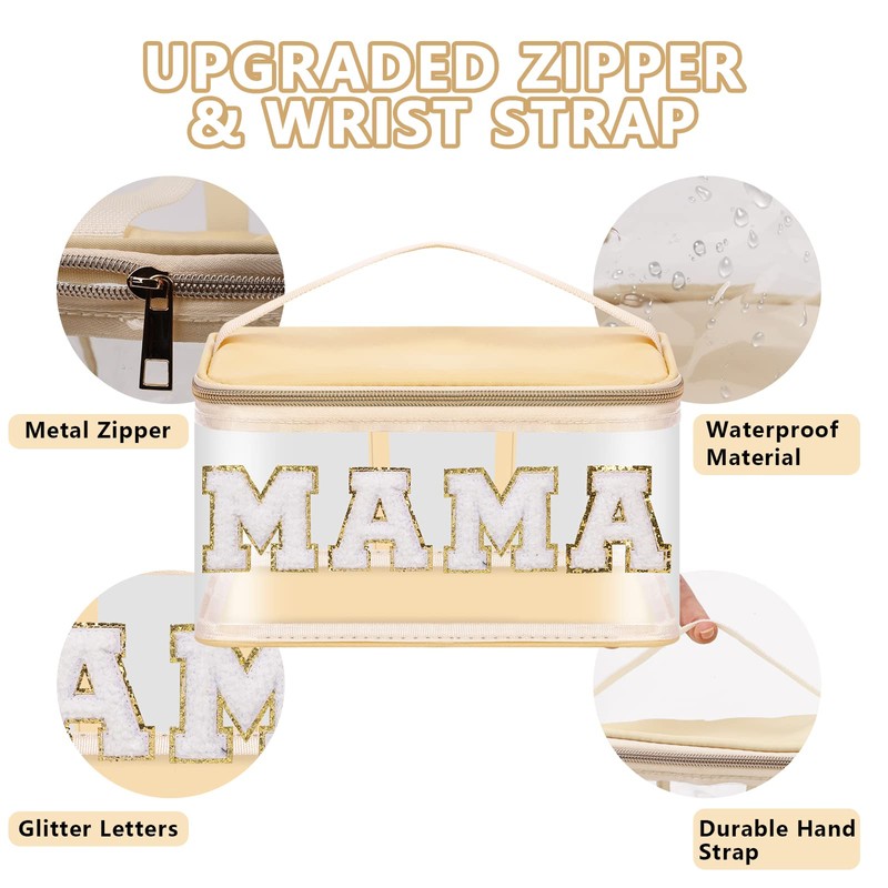 Iqimott Preppy Clear Makeup Cosmetic Bag for Women Travel, Nylon PVC Chenille Glitter Letter Toiletry Storage Tote Bag, Transparent Waterproof Organizer Zipper Pouch with Handle(Mama, Beige)