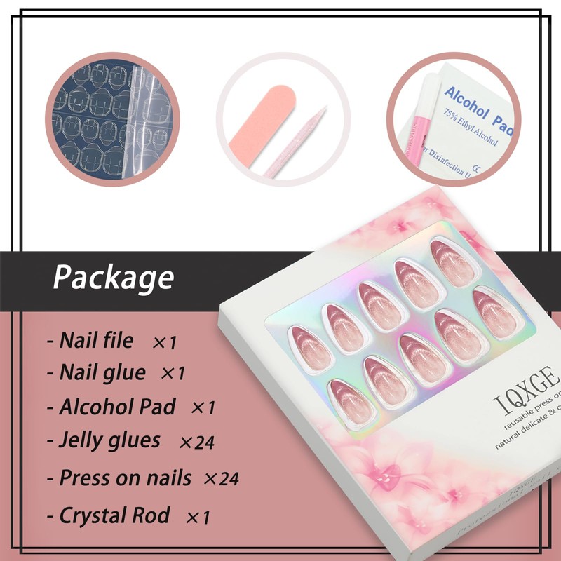 - 【Package Contents】The package includes 24 pcs press on nails, 1 sheet of 24-grain jelly glue, 1 nail file, 1 nail glue, 1 crystal cuticle pusher stick, and 1 bag of alcohol prep pads. These exquisitely crafted fake nails allow you to create beautiful manicures at home.