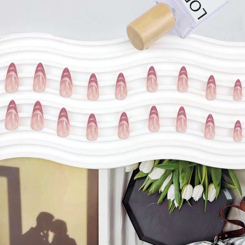 IQXGE Cat Eye Acrylic Press on Nails Almond Medium Acrylic Nails Press Ons Full Cover Glue on Fake Nail with Purple Ombre Designs Bling Glossy Artificial Stick on False Nail for Women