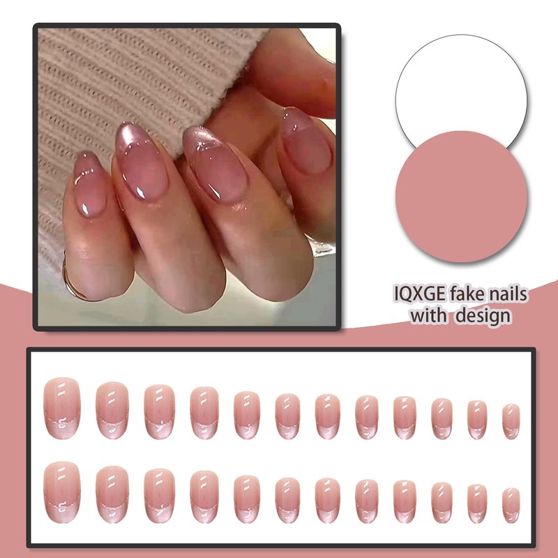 IQXGE Short Almond Press on Nails French Tip Full Cover False Fake Nails Press ons Cat Eye Stick on Nail Pink Glitter Acrylic Fake Nail with Pink Curve Artificial 24Pcs Reusable for Women