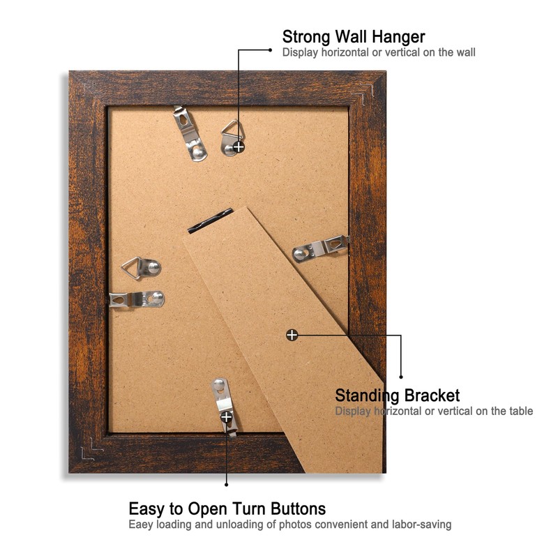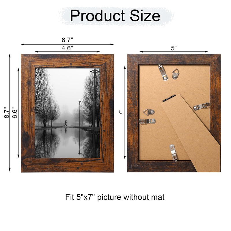 - VERSATILE DISPLAY: 5x7 picture frame dark brown is designed with strong brackets on the back, You can hang them horizontally or vertically for gallery-style wall mount, and can also use a stand to place them on a table for display. Your home or office will sparkle with your artful photographs.