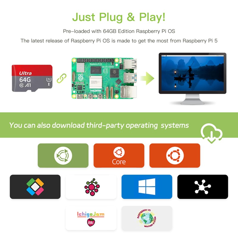 - Pre-installed with 64-bit the latest version OS:Just Plug & Play! The latest release OS( Bookworm) is optimized for the Raspberry Pi5, offering exceptional desktop performance for work, leisure, enterprise, and beyond.