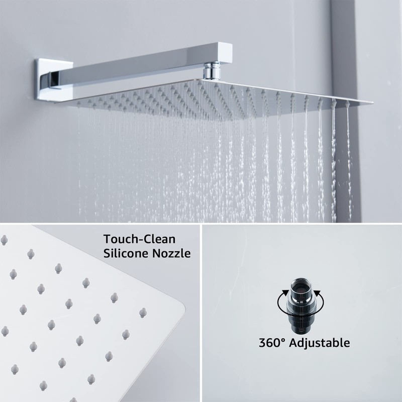 - Package include: 1*12 inch Square rain shower head(304 stainless steel), 1*handheld shower head(Brass), 1*16 inches shower arm(304 stainless steel), 1*1.5M shower hose(304 stainless steel),1*shower holder(Brass), 1*shower mixer control valve(Brass);