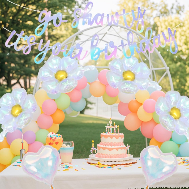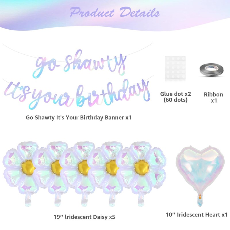 - Package Contains: You'll get 5pcs pcs Iridescent foil flower balloons, 2pcs Holographic heart foil balloon,1 set iridescent go shawty it’s your birthday banner,2 sheets dot glue(40 dots), 1pcs silver ribbon.
