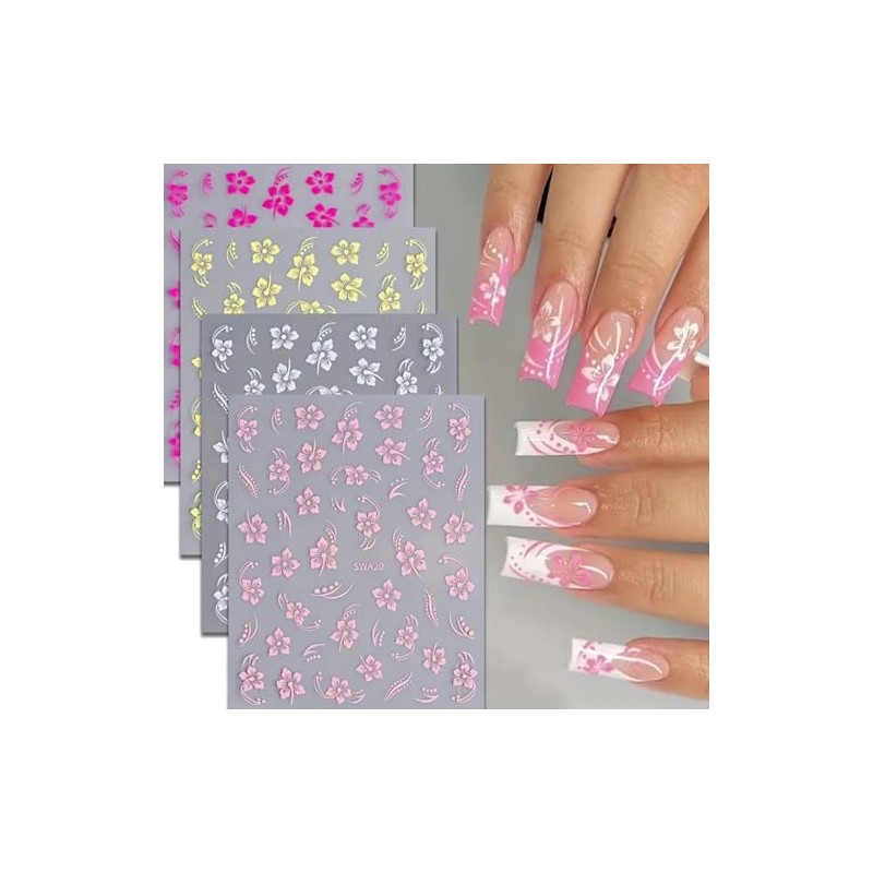 Decora tus uñas con estilo tropical con el pack de 8 hojas de pegatinas para uñas 3D Irikdescia. Diseñadas con flores de hibisco en tonos blanco, rosa, amarillo y fucsia, estas pegatinas autoadhesivas ofrecen un efecto en relieve realista que añade profundidad y elegancia a tus diseños de uñas.