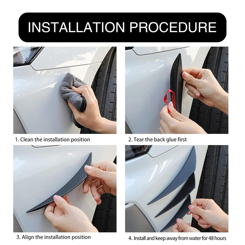 - DIY Self-adhesive: The bumper lip separator fins come with double-sided self-adhesive tape. First, clean the surface of the car, keep it dry and clean, then peel off the adhesive; when it is cold, use a hot hair dryer to heat the adhesive properly, so that it will not fall off.