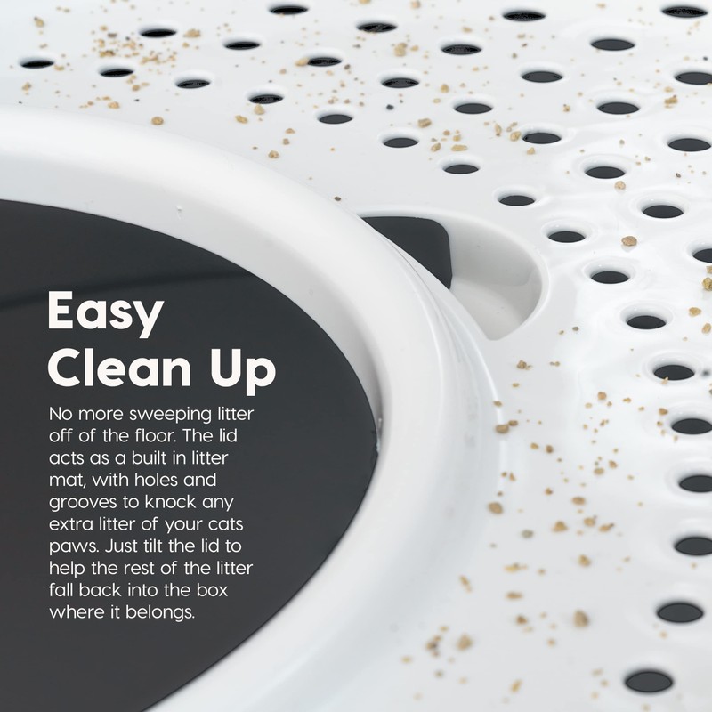 - TIDY - The little holes in the lid catch any lingering litter particles on your cat's paws and keep them from spilling out onto the floor, keeping the area neat and clean and making clean-up a breeze.