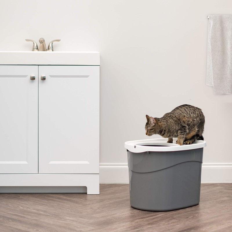 - TOP ENTRY - The top entry of the cat litter pan means more privacy for your cat, less litter spillage, and any spraying remains contained within the tall walls of the kitty litter box. It also functions to keep other pets, such as dogs, out of your cat's business, making for a stress-free environment for everyone.