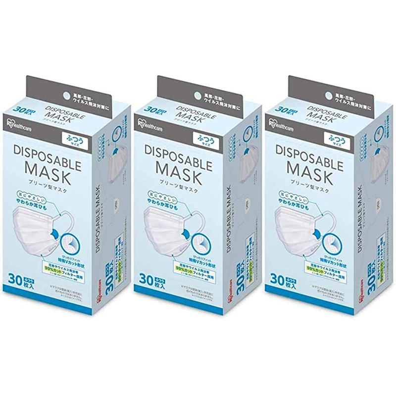 Iris Ohyama 20PN-30PM Disposable Pleated Mask, Regular Size, 30 Pieces x 3 Sets