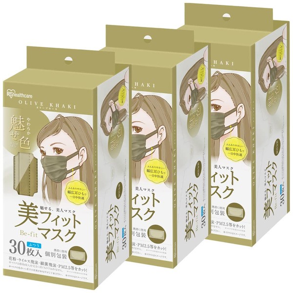 Iris Ohyama PK-BFC30MOK Beautiful Fit Mask, Non-woven Fabric, Regular Size, 30 Pieces, Olive Khaki