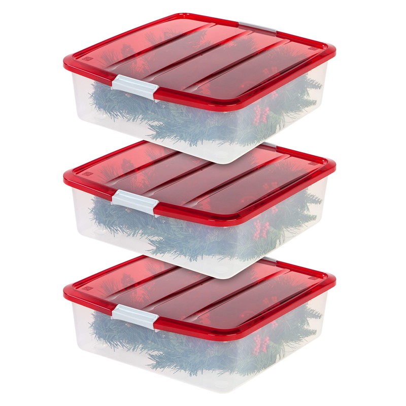 IRIS USA 33 Qt. Holiday Wreath Storage Container Box with Lid, 3-pack, Stackable Under Bed Storage Organizer Bin with Latching Buckles for 20" Wreaths Festive Holiday Decorations Garlands, Clear/Red