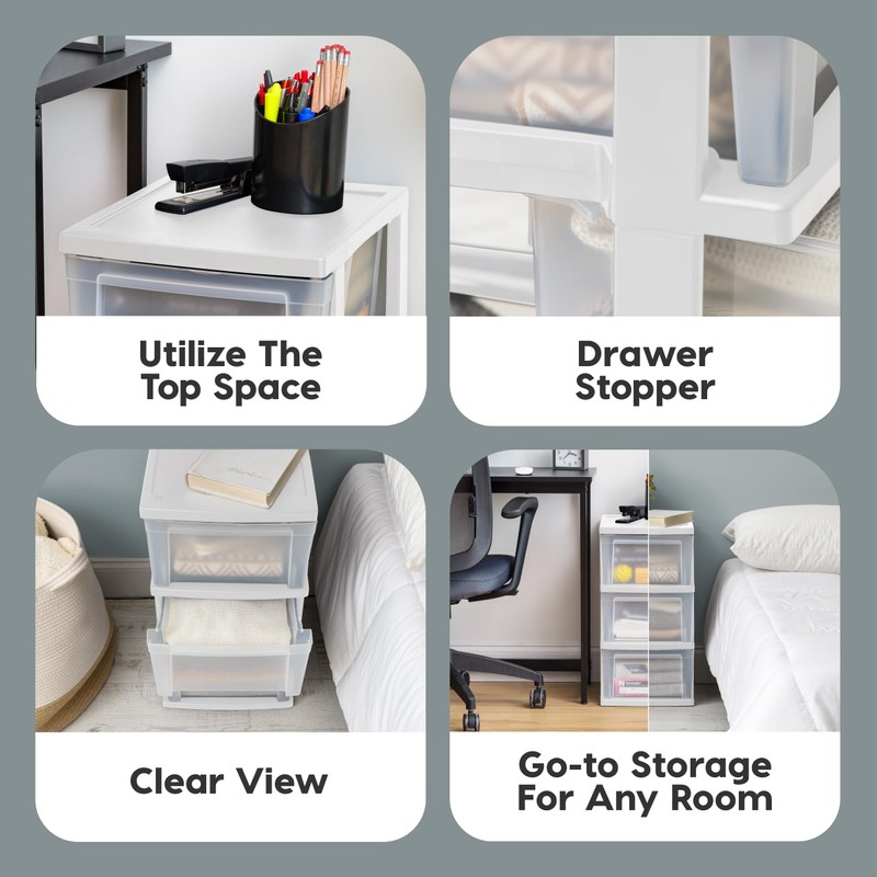 - MADE IN USA- Excellent way to organize rooms, offices, and dorms. The clear drawers allow you to easily see what's inside and give you plenty of space to store your items while the narrow frame lets you make the most of limited space.