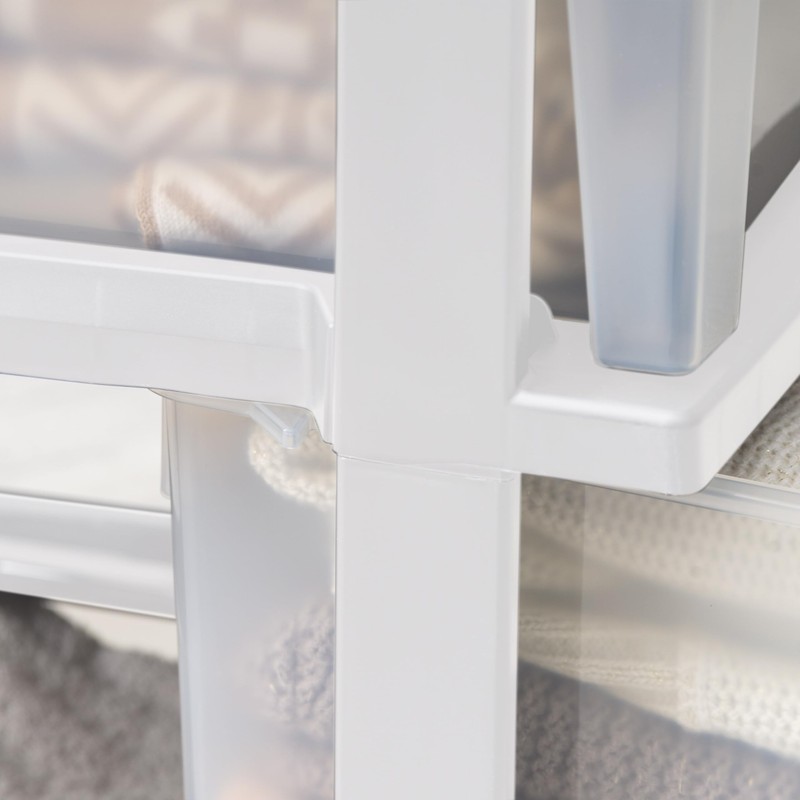 - VERSATILE - The white frame fits perfectly with most décor and provides a sturdy place to store your items and display your favorite things on top. The see-through plastic cabinet with drawers allows for easy identification of all your items.