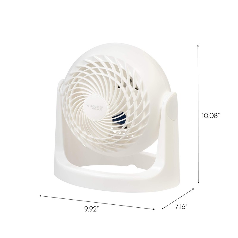 Perfect for the office, home or a dorm room, the WOOZOO personal fan offers powerful cooling air while compact size unit saves space. The adjustable fan head pivots vertically 360 degrees, with three speeds settings on tabletop circulator to meet your cooling needs. Enjoy extra-quiet cooling on the virtually silent “low” setting. Desktop fan provides up to 157 ft area coverage, and the 70.9” cord makes it easy to reach the outlet.