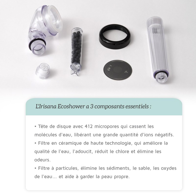- ÖKO-DUSCHE IR15: Wenn wir duschen, wird unsere Haut aufgrund der Mischung aus Wasser und Wärme viel empfindlicher und verletzlicher. Angesichts dieser Situation ist die Ecoshower ideal zum Reinigen, Befeuchten und Tonisieren von Haut und Haar.
