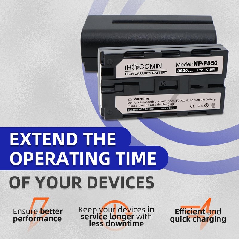 - -MULTIPLE PROTECTIONS- iROCCMIN NP-F550 battery provides over-charging, over-current, over-voltage, short-circuit, and high temperature protections, and adopts high-quality fireproof structure to effectively avoid safety issues.