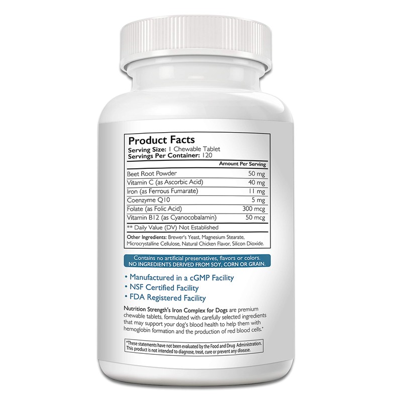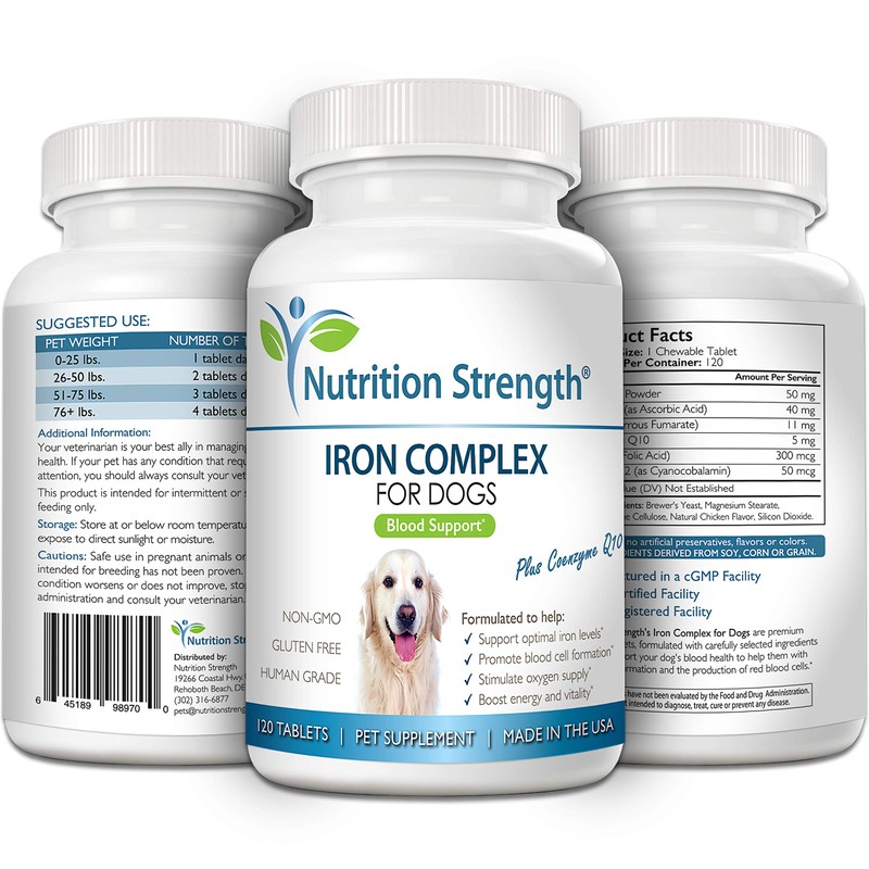 - Made in the USA: Nutrition Strength's iron for dogs to support blood health, promote blood cell formation and oxygen supply, iron supplement for anemic dogs with vitamin C, folate and vitamin B12 is human grade; our premium canine iron tablets meet the strictest animal supplement manufacturing guidelines, to guarantee your pet's safety, and are made with carefully selected, high quality ingredients for optimal results