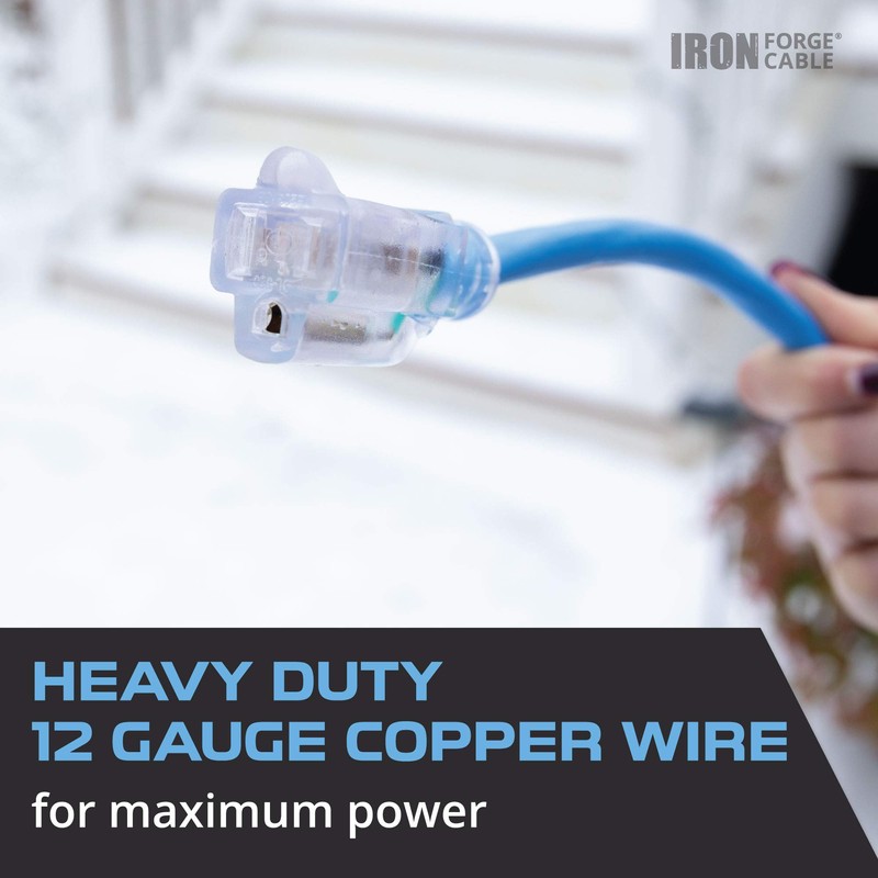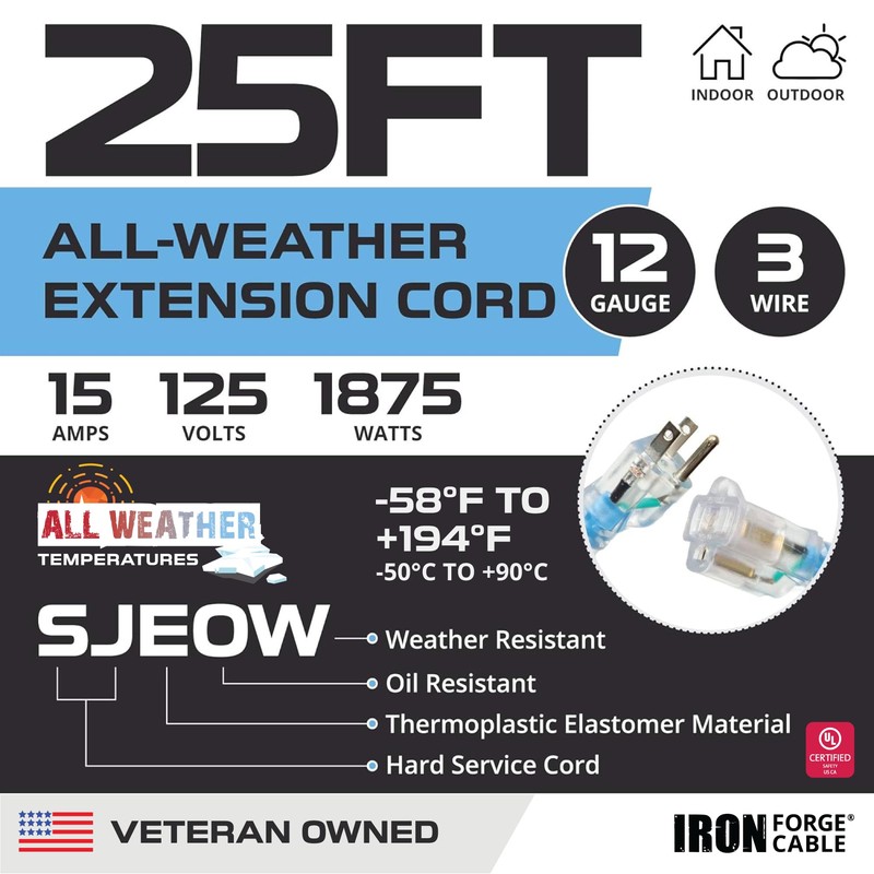IRON FORGE CABLE 25 Ft All Weather Extension Cord - Stays Flexible in Extreme Cold & Hot Temperatures from -58°F to +221°F - 12/3 SJEOW Heavy Duty Lighted Outdoor Extension Cable
