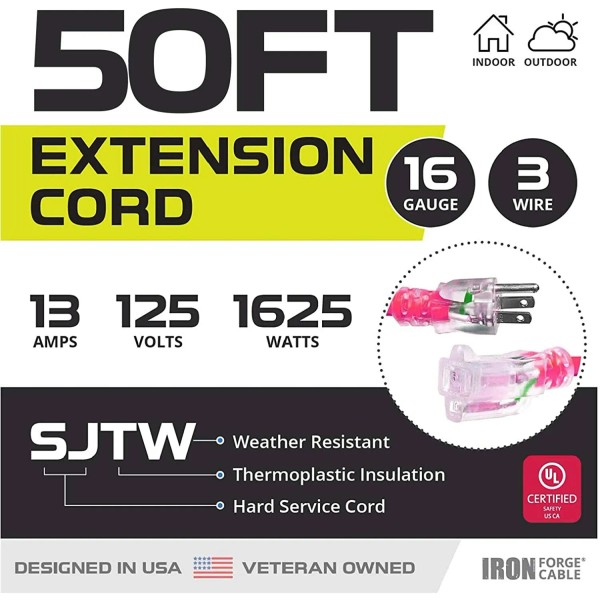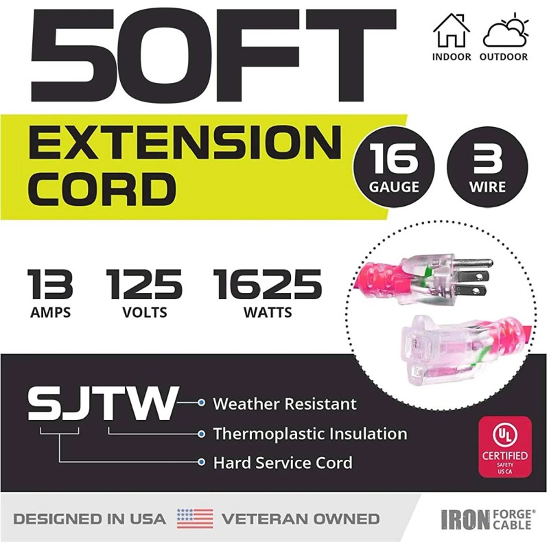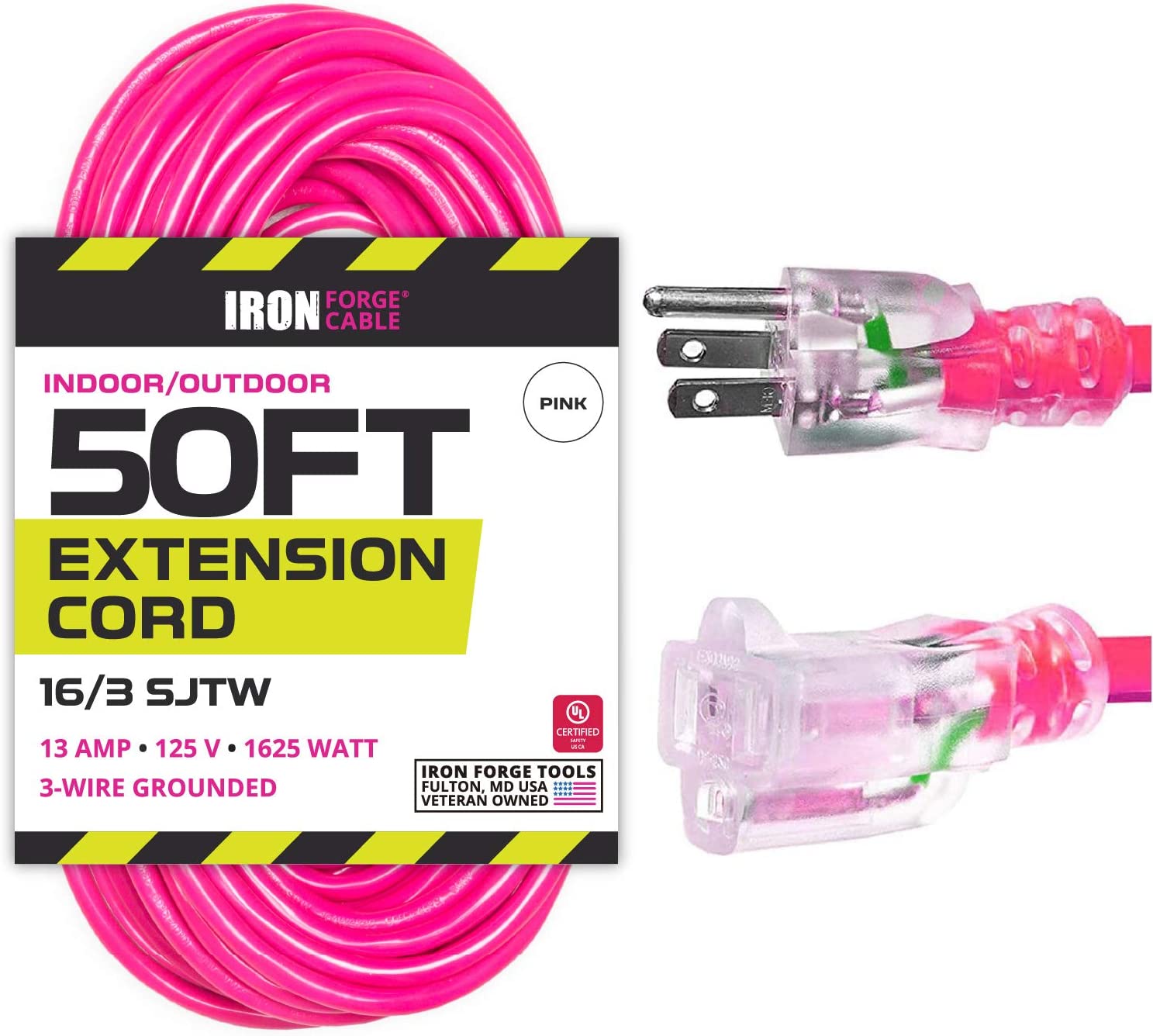 Iron Forge Tools 50 Ft Outdoor Extension Cord - 16/3 SJTW Durable Pink Cable