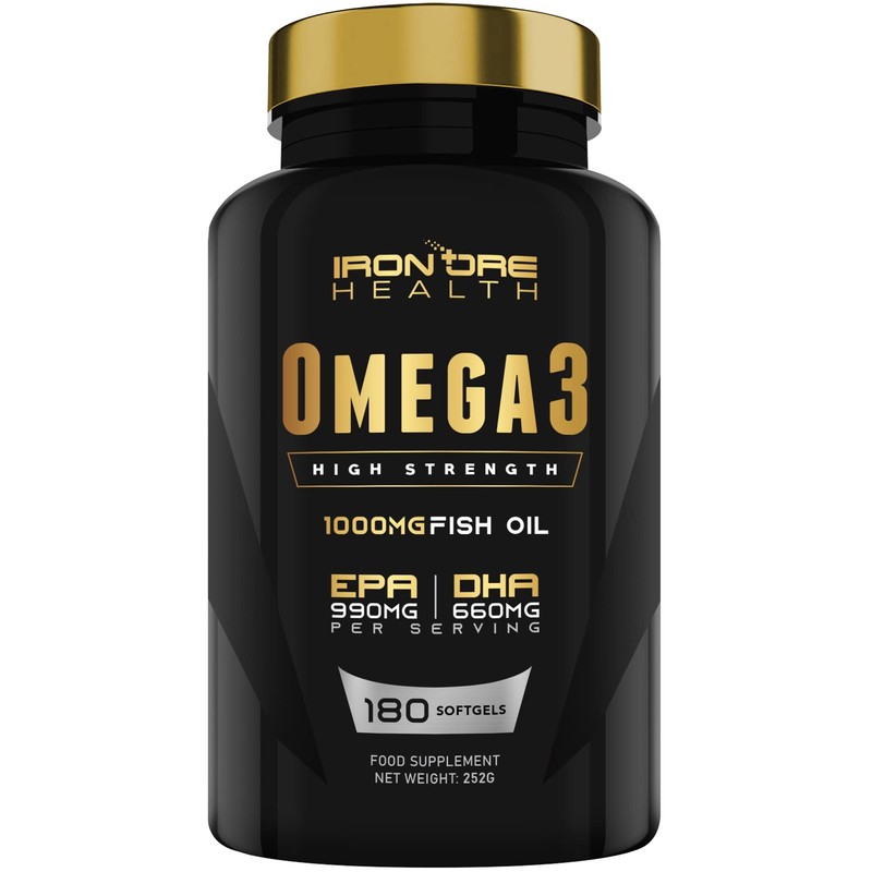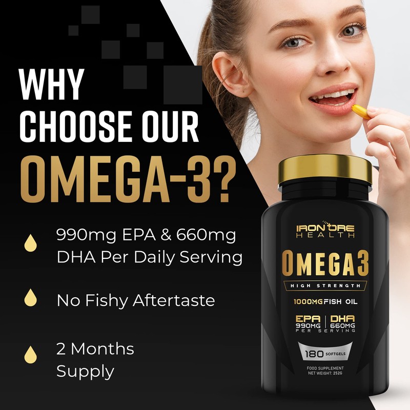 Iron Ore Health Omega 3 Fish Oil - 180 High Strength Capsules - 990mg EPA & 660mg DHA per Daily Serving - 2 Months Supply - Made in UK