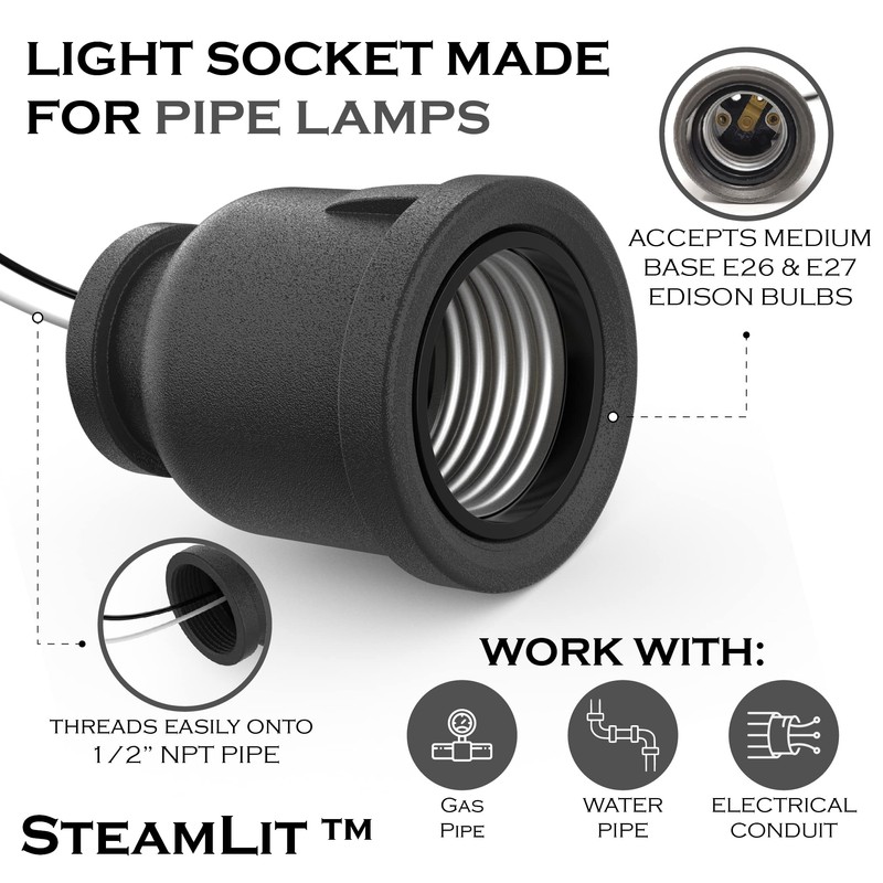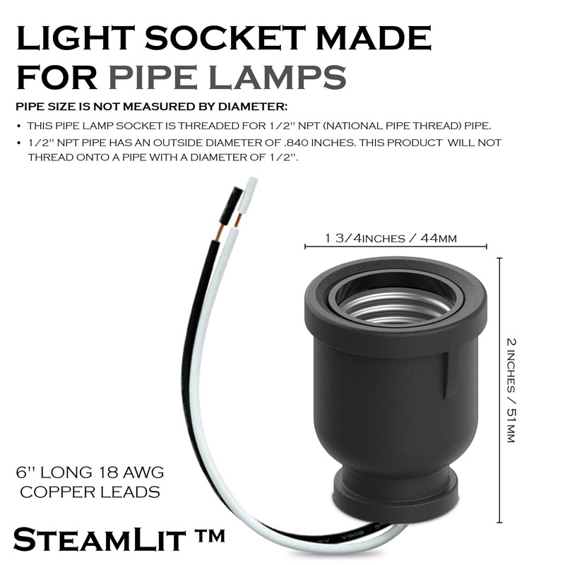 - Pipe lamp socket for 1/2 inch gas, black, or galvanized NPT pipe.