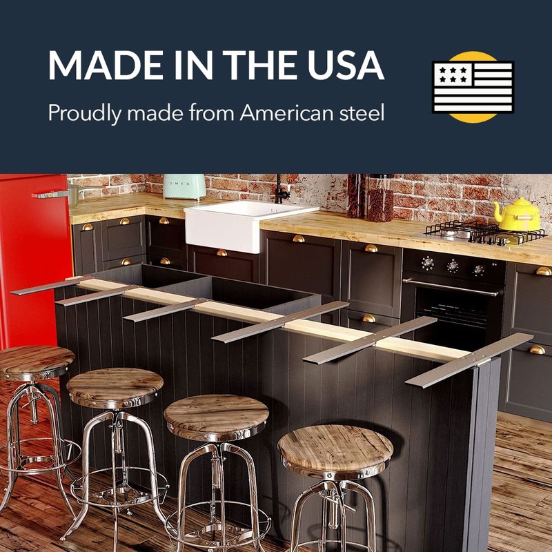 These brackets are made in the USA from solid American steel. They have a smooth beveled end for safety, and a narrow profile for a nearly invisible, clean look that will blend well with any decor. They are made to screw into 2x4” or 2x6” lumber to hold securely and safely so your countertops won’t tilt, tip, or break.