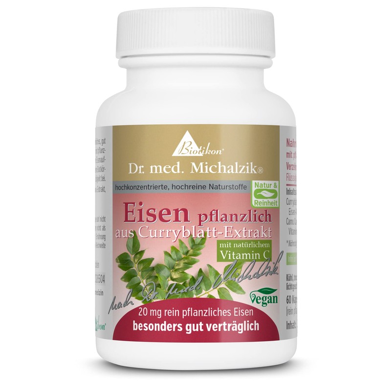 Vegetable iron from curry leaf extract according to Dr. Michalzik. A real gift from nature - not only for vegans and vegetarians. The daily dose of 2 capsules contains 20 mg of natural iron. This is complemented by vegetable vitamin C from the Camu Camu plant for optimal iron absorption. Iron from curry leaf extract is vegetable bound and therefore particularly well tolerated. Synthetic iron supplements can cause unpleasant side effects, especially gastrointestinal problems such as diarrhea, nausea or constipation.