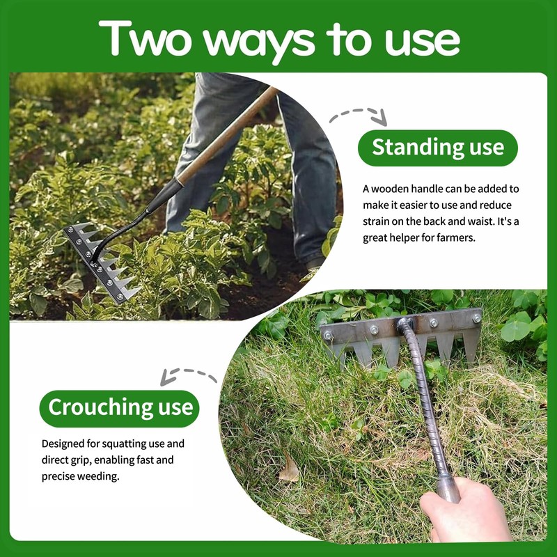 - Designed with ergonomics in mind, the Iron Weeding Rake offers a comfortable, non-slip grip that helps reduce hand fatigue during extended use. For added convenience, you can attach a wooden handle (this product does not include a wooden handle, which is sold separately) to transform the rake into a long-handled tool, allowing you to work while standing and minimizing back strain.