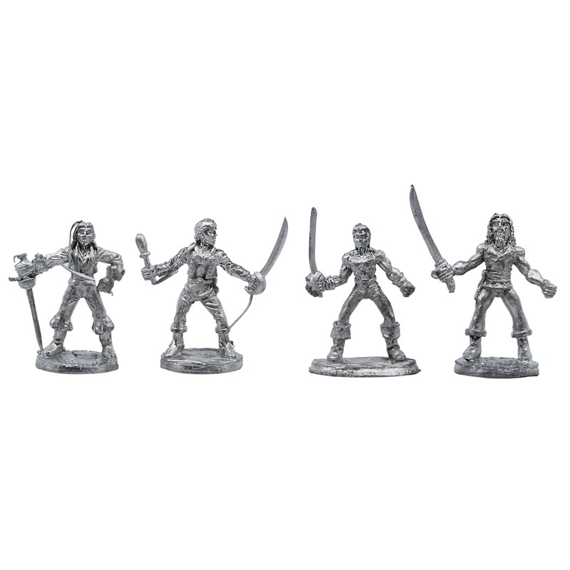4 piece pirates set - Measuring 32.7mm to 41.4mm tall (26.4mm to 30mm from feet to eyes), pieces feature an incredible amount of detail for dungeon-crawling, RPGs and table top war games. All Iron Wind Metals/Ral Partha miniatures are hand carved and cast in the USA from 100% lead free pewter. Miniatures come unassembled and unpainted with attached bases - Some filing may be needed to clean up excess flashing or sprue.