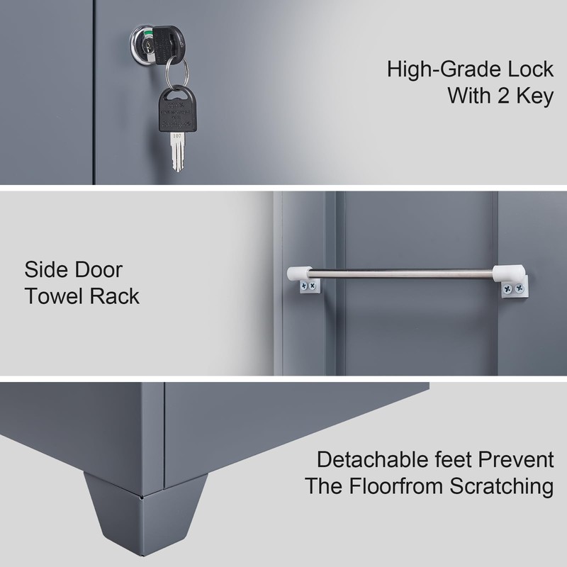 - 【MULTI-PURPOSE】The metal storage cabinet can store different items such as mops, brooms, fishing rods, towels, clothes, documents,etc. and can be used in garages, homes, warehouses, laundries,or anywhere you need a secure storage space.