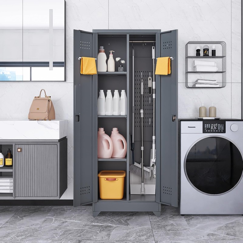 - 【DURABLE CONSTRUCTION】The broom closet cabinet is made of pure steel material, sturdy and durable. The cleaning supplies cabinet surface powder coating is waterproof and scratch-resistant, easy to clean, avoids corrosion and rust.