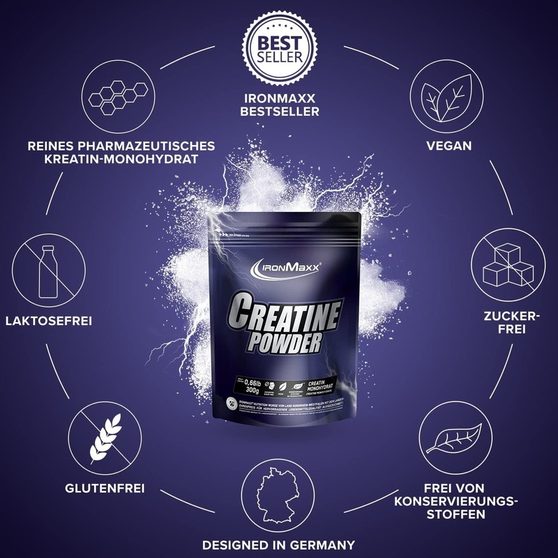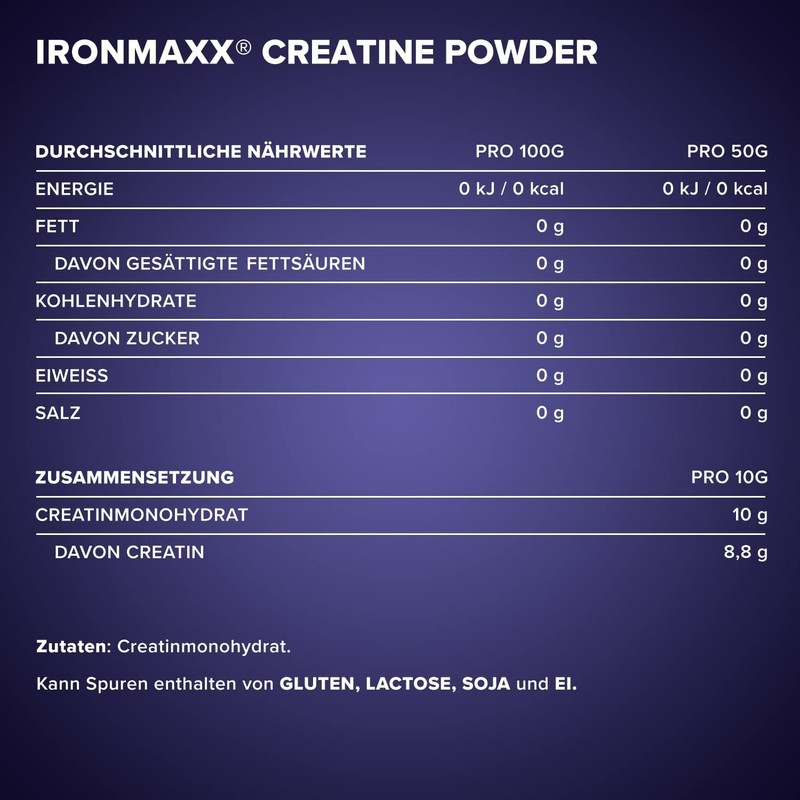 ProduktbeschreibungIronMaxx - die Nummer 1 in Sachen Bodybuilding, Fitness, Di?t und Gesundheit!Ganz nach dem Motto: "Sportern?hrung muss wirken und Sportern?hrung muss schmecken!" entwickelt IronMaxx zukunftsweisende und innovative Sportnahrung in h?chster Qualit?t.Besonders im Bereich von Proteinpulver konnte IronMaxx in den letzten Jahren mit der Entwicklung von Proteinpulvern auf Wasserbasis gro?e Erfolge erzielen. Das Sortiment von IronMaxx umfasst nicht nur Produkte in Pharma- und Bioqualit?t, sondern auch Produkte auf der K?lner Liste. So hilft IronMaxx jedem Sportler, seine individuellen Ziele zu erreichen.MarkenbeschreibungIronMaxx - die Nummer 1 in Sachen Bodybuilding, Fitness, Di?t und Gesundheit!Ganz nach dem Motto: "Sportern?hrung muss wirken und Sportern?hrung muss schmecken!" entwickelt IronMaxx zukunftsweisende und innovative Sportnahrung in h?chster Qualit?t.Besonders im Bereich von Proteinpulver konnte IronMaxx in den letzten Jahren mit der Entwicklung von Proteinpulvern auf Wasserbasis gro?e Erfolge erzielen. Das Sortiment von IronMaxx umfasst nicht nur Produkte in Pharma- und Bioqualit?t, sondern auch Produkte auf der K?lner Liste. So hilft IronMaxx jedem Sportler, seine individuellen Ziele zu erreichen.Inhaltsstoffe / ZutatenCreatinmonohydratGebrauchsanweisungMischen Sie 1 Teel?ffel (ca.5g) mit Wasser oderMilch. Wir empfehlen das Vermischen mit Weightgainern oder Proteinshakes. Trinken Sie jeweils 1 Portion30 Minuten vor und direkt nach dem Training. An trainingsfreien Tagen eine Portion kurz vor demFrhstck und eine kurz vor dem Abendessen trinken.WarnhinweiseKann Spuren enthalten von Gluten, Lactose, Soja und Ei. Die Zufuhr von Creatin sollte insgesamt nur wenige Wochen lang erfolgen. Es kann eine Gewichtszunahme eintreten. Das Produkt ist fr Kinder und Jugendliche ungeeignet. Um die positive Wirkung zu erzielen, sollten 3 g Creatin pro Tag verzehrt werden.Anschrift Hersteller/ImporteurIronMaxx Nutrition GmbH & Co. KG, Wegelinstr. 15, 50354 Hrth, Deutschland