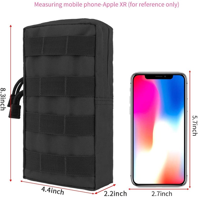 • Molle Pouch: Dimensions: 8.3" x 4.4" x 2.2". Two-way zippers are very convenient. Perfect for storing cellphone, tactical pen, keychain, GPS device, digital cameras, medical supplies, ammo, paracord or any necessary gadgets you need. It can be attached to belt, backpack, platform, etc.