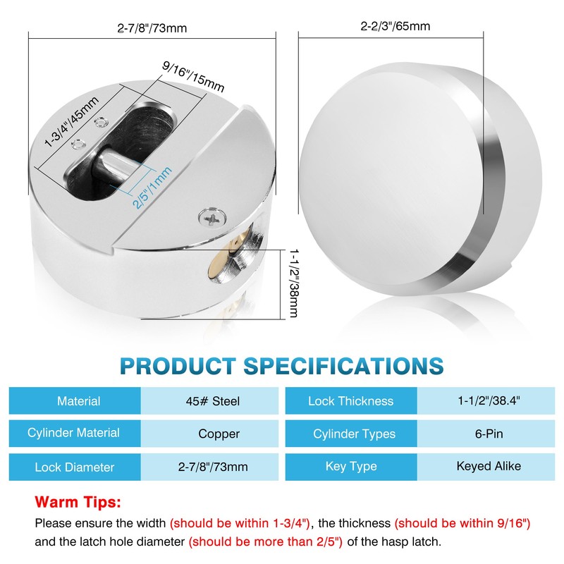 - 【73mm Universal Fit Puck Lock Set】The IRONWALLS heavy-duty hidden shackle puck lock features a generous diameter of 2-7/8” (73mm) and a height of 1-1/2” (38.4mm), making it an ideal choice for securing most of residential or commercial doors. Please note that the lock hasp is not included in this product. Therefore, please ensure your hasp latch with the width (should be within 1-3/4”), the thickness (should be within 9/16” ) and the latch hole diameter (should be more than 2/5”) before purchasing.