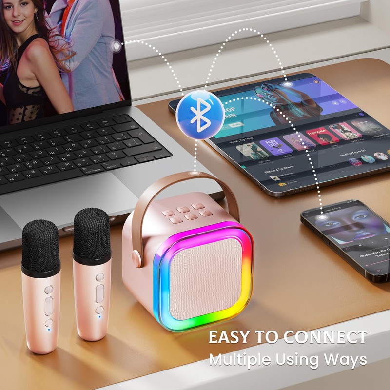 - Seamless Bluetooth Connection: This karaoke machine comes with speaker and wireless microphone that automatically connect to each other upon startup. Bluetooth 5.3 technology ensures instant pairing, stable connection, and an impressive range of 50 ft without obstacles. Perfect for parties and gatherings! Mini but powerful and loud, let you stay always from complex links and cables