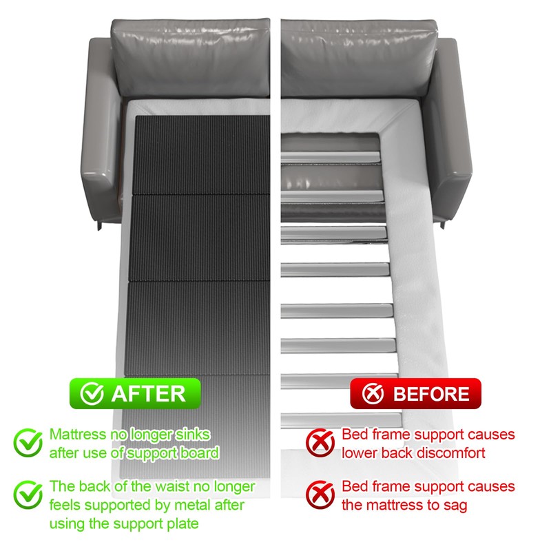 • Sofa bed new experience:Older sofa beds are supported by bottom springs and fabrics, and you can feel the discomfort and lack of support from the back springs while sleeping.Sofa bed support boards can be a good solution to this problem! Simply place it on top of the sofa bed to solve the problem of sagging and springs due to insufficient support and improve the quality of sleep.