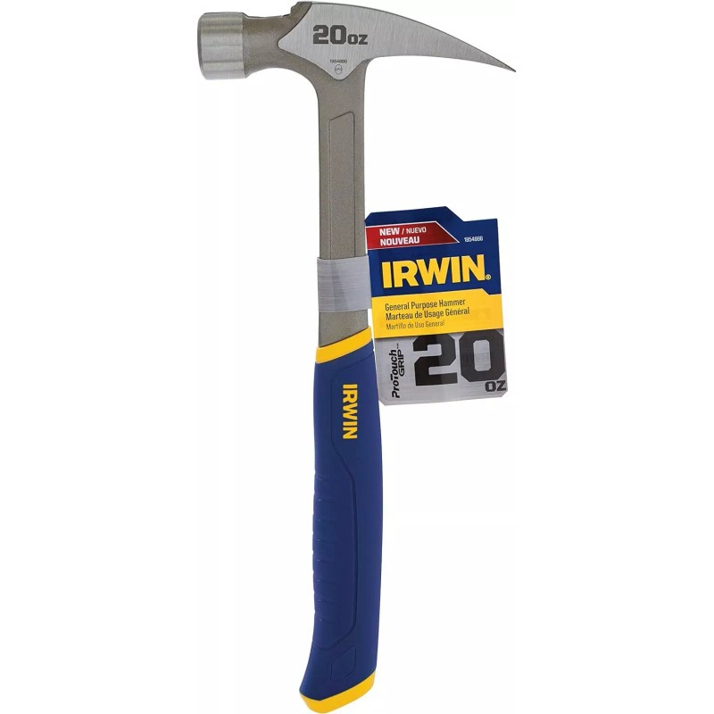 The IRWIN General Purpose Claw Hammer, Steel, 20 oz., combines the strength of a solid forged steel head with the comfort of a custom designed Pro-Touch Grip to create one of the best hammers ever built. It features a smooth face to prevent surface marks and a magnetic nail holder for hands free versatility when setting a nail. Its hybrid handle design offers a rounded grip for more comfort, a curved base to prevent slippage and a hardened end cap for maximum durability.