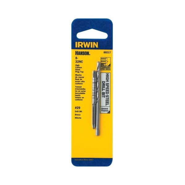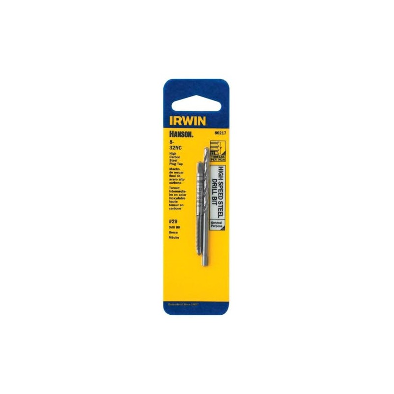 Drill and Tap Packs, include 8 - 32 Tap + No. 29 Drill. Black oxide finish on all high carbon steel Hanson taps with semi-porous matte surface that causes cutting oil to cling, carrying the oil into the cut more effectively, thus reducing the drive torque required and lowering cutting temperatures. Oxide surface-coating also reduces tendency for chips to weld to the Tap, resulting in lower cutting temperatures and freer chip flow to increase tool life. Irwin tools are made of only the finest materials, manufactured to exacting tolerances.