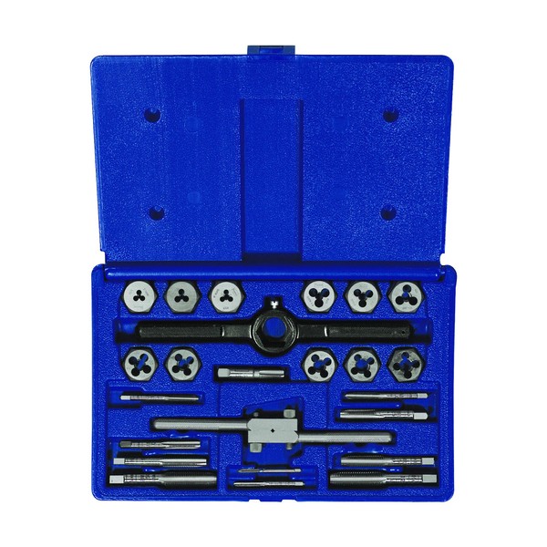 24 Piece, Metric Tap & Hex Die Set, Dies Are Ideal For Routine Maintenance, Repair Work & For Rethreading Where High Accuracy & Tolerance Thread Is Not Critical, Taps Have Straight Flutes Which Are Ground To Provide Rapid Chip Removal For Efficient Threading, Designed For Hand Threading Work In A Variety Of Materials Taps Produce A Class 2B Thread, Includes Metric 3 mm x 0.50, 4 mm x 0.70, 5 mm x 0.80, 6 mm x 1.00, 7 mm x 1.00, 8 mm x 1.25, 9 mm x 1.25, 10 mm x 1.50, 12 mm x 1.50, 12 mm x 1.7M Taps & Dies, Pipe 1/8inch x 28 BSP Tap & Die, Plain Die Stock For 1inch Dies, Offset Adjustable Tap Wrench For Taps #0 - 1/2inch.