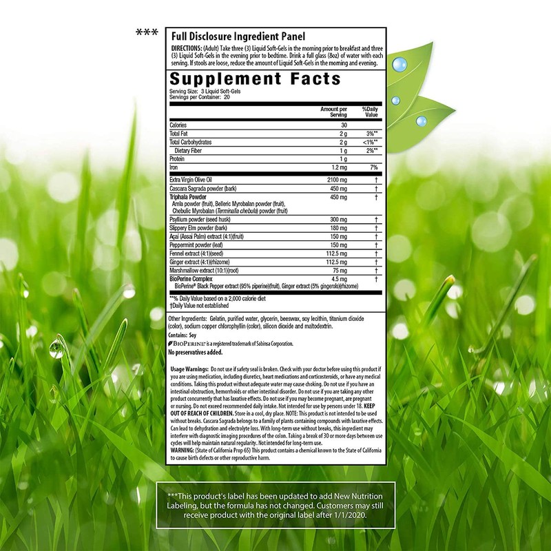 - ADVANCED DELIVERY SYSTEM - Delivers a powerful combination of natural ingredients like triphala, psyllium, slippery elm, acai and peppermint. These easy-to-swallow liquid soft-gels provide an optimum delivery system to release these nutrients fast without any added preservatives, binders or fillers.