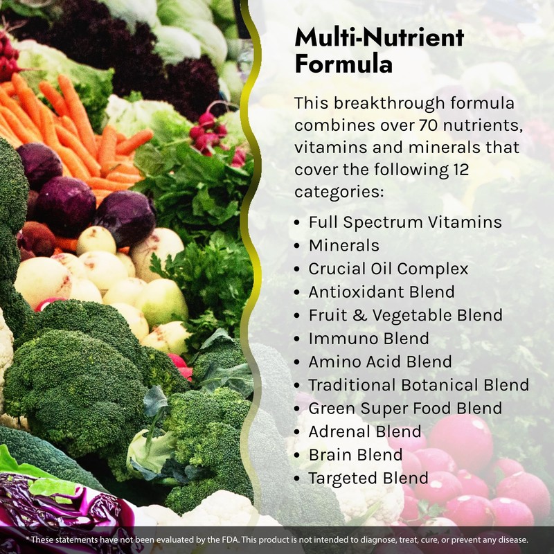 - FULL SPECTRUM SUPPORT - Breakthrough formula combines over 70 nutrients, vitamins and minerals that cover the following 12 categories: Full-Spectrum Vitamins, Minerals, Crucial Oil Complex, Antioxidant Blend, Fruit & Vegetables Blend, Immuno Blend, Amino Acid Blend, Traditional Botanical Blend, Green Super Food Blend, Adrenal Blend, Brain Blend and Targeted Blend.